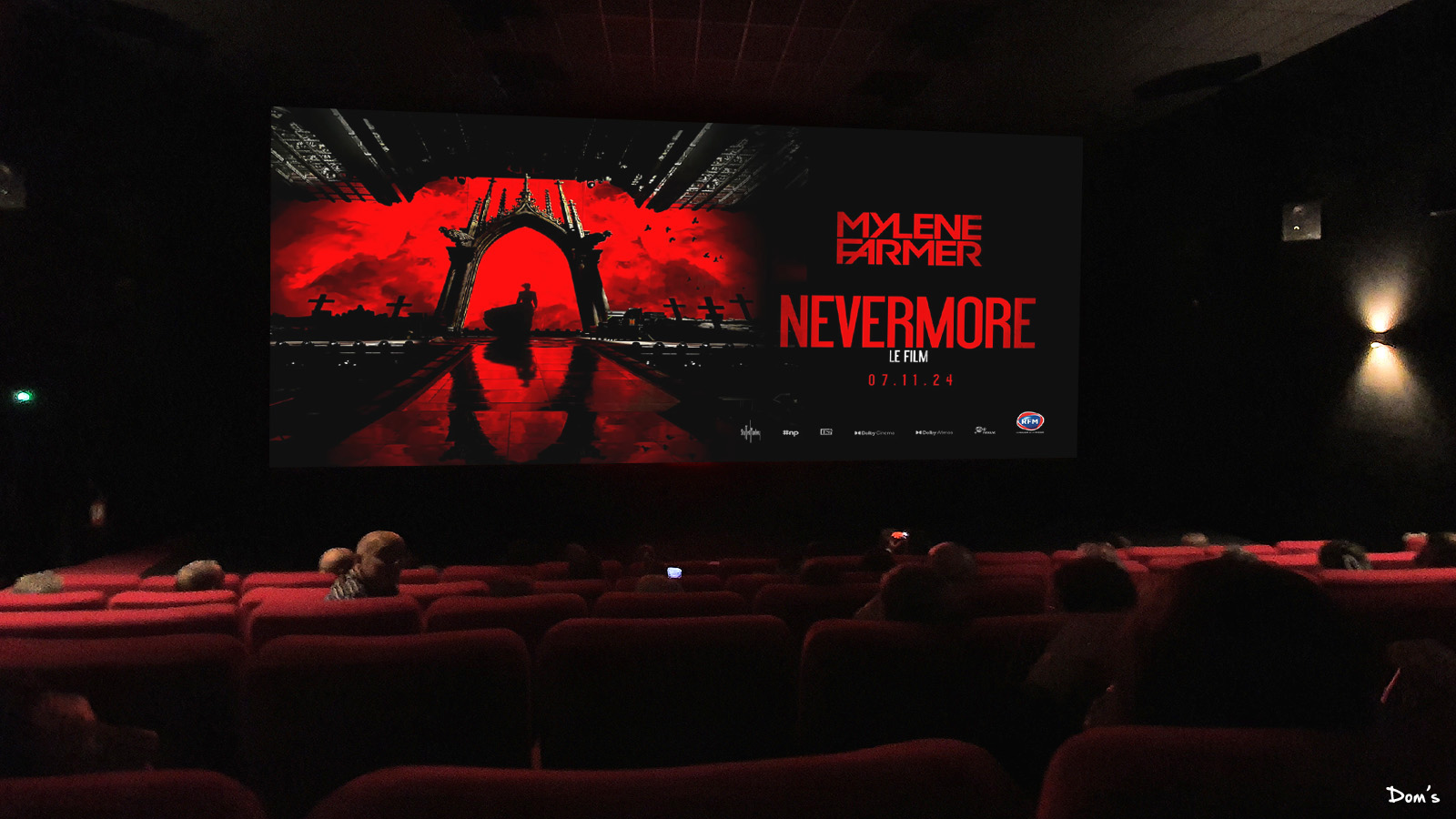 Ce jeudi 7 novembre à 20 h, tous les cinémas de l'hexagone ont projeté en exclusivité le film-événement, Nevermore, le concert de Mylène Farmer enregistré au Groupama Stadium de Lyon les 23 et 24 juin de la tournée 2023. Le Cinéplanet place Morgan à Salon a fait salle comble. Voici quelques photos de notre belle et radieuse Mylène, prises sur un écran de cinéma, à la sauvette avec un phone, les fans pardonneront la mauvaise qualité des images. Pour information, le film a attiré 200.000 spectateurs en France pour la seule séance de ce 7 novembre 2024.